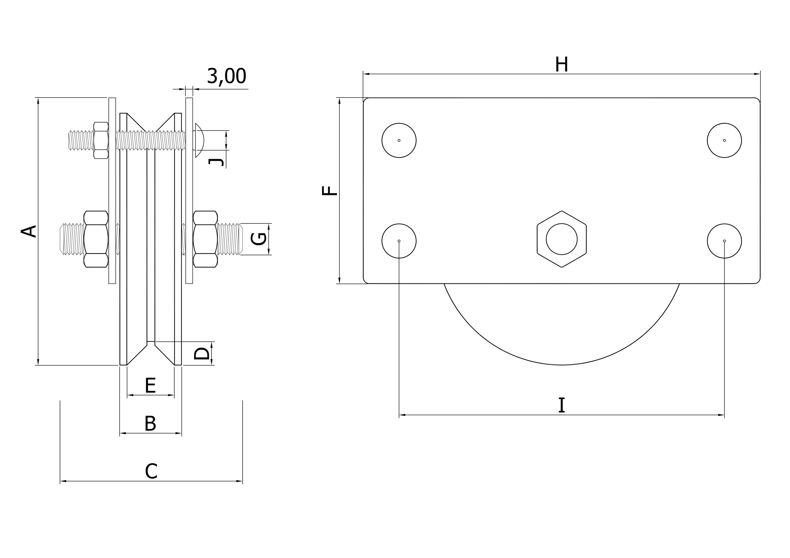 ROLDANA CANAL (V) EM AÇO 1020 COM 2 ROLAMENTOS E SUPORTE LATERAL COM ACABAMENTO ZINCADO